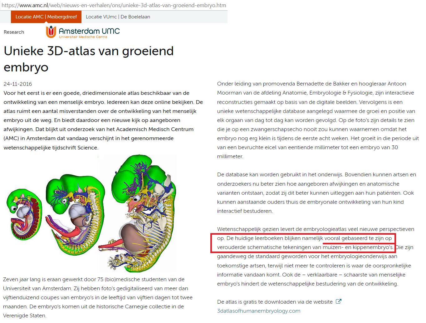 Muis en kip embryo’s. Wist u dat: “De huidige leerboeken blijken namelijk vooral gebaseerd te zijn op verouderde schematische tekeningen van muizen- en kippenembryo’s. Die zijn gaandeweg de standaard geworden voor het embryologieonderwijs aan toekomstige artsen… Persbericht AMC/UMC 24-11-2016 3D atlas Amsterdam UMC Locatie AMC – Unieke 3D-atlas van groeiend embryo