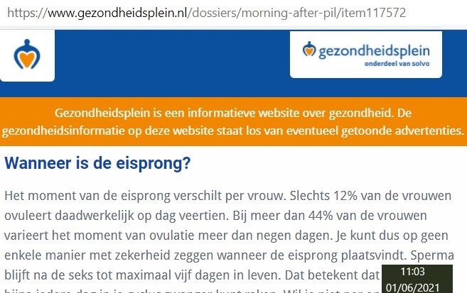 “Het moment van de eisprong verschilt per vrouw. Slechts 12% van de vrouwen ovuleert daadwerkelijk op dag veertien. Bij meer dan 44% van de vrouwen varieert het moment van ovulatie meer dan negen dagen. Je kunt dus op geen enkele manier met zekerheid zeggen wanneer de eisprong plaatsvindt. Sperma blijft na de seks tot maximaal vijf dagen in leven.” Retrieved 1 June 2021 https://www.gezondheidsplein.nl/dossiers/morning-after-pil/item117572