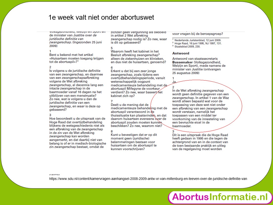 En natuurlijk valt hier alles van de eerste week buiten, (zgn anticonceptie) omdat de wet heeft aangegeven dat die er buiten valt: “In de Wet afbreking zwangerschap wordt geen definitie gegeven van een zwangerschap. In artikel 1 van de Waz wordt alleen bepaald wat voor de toepassing van deze wet niet onder een afbreking van een zwangerschap wordt verstaan, namelijk het toepassen van een middel ter voorkoming van de innesteling van een bevruchte eicel in de baarmoeder.”