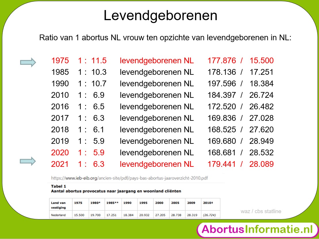 Op blz. 29 van het WAZ overheidsrapport 2017 is te zien dat abortus bij Nederlandse vrouwen tussen 1990 en 2017 met 47% is toegenomen, terwijl de ratio (verhouding) tussen abortussen en levendgeborenen per jaar toenam van 93 naar 159.