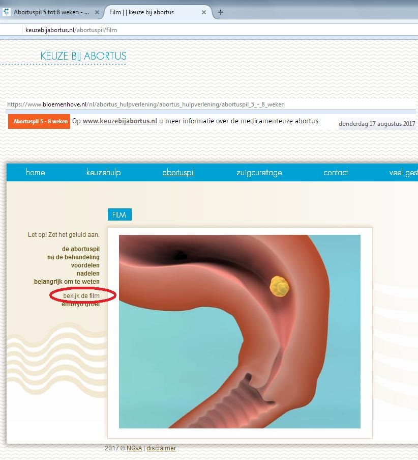 16.3.2021 gaat de link niet meer naar het filmpje, maar ‘keuzebijabortus.nl’ gaat nu automatisch door naar NGVA website, en de film is niet meer te zien op eerdere link. Deze screenshots waren van 17.8.2017. 1.4.2021 staat keuzebijabortus.nl nog steeds vermeld op de site van Gynaikonklinieken (Rotterdam en Roermond)
