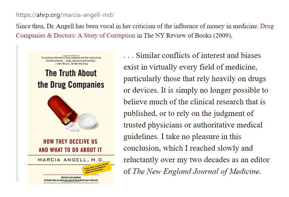 Dr. Marcia Angell, a physician and long-time Editor in Chief of the New England Medical Journal (NEMJ), which is considered to be another one of the most prestigious peer-reviewed medical journals in the world, makes her view of the subject quite plain: