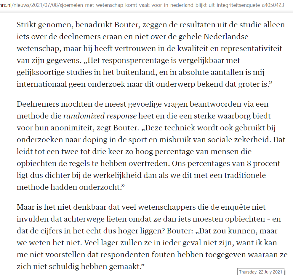 “Maar is het niet denkbaar dat veel wetenschappers die de enquête niet invulden dat achterwege lieten omdat ze dan iets moesten opbiechten – en dat de cijfers in het echt dus hoger liggen? Bouter: „Dat zou kunnen, maar we weten het niet. Veel lager zullen ze in ieder geval niet zijn, want ik kan me niet voorstellen dat respondenten fouten hebben toegegeven waaraan ze zich niet schuldig hebben gemaakt.”