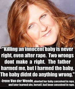In a study ‘Victims and Victors’, none of the women who gave birth to a child conceived in sexual assault expressed regret or wished they had aborted instead, whereas almost 80% of the women who aborted a pregnancy conceived in sexual assault reported that abortion had been the wrong solution, many expressing it only increased the trauma. I was not prepared for the regret.