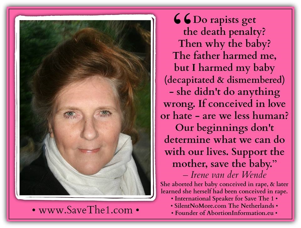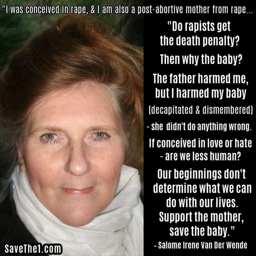 Whether conceived in hate, or in love with wine and roses, makes no difference to my right to remain alive. I owe my life to politicians who didn’t gleefully sign off my life with the stroke of a pen, to be thrown in the bottom of a garbage bin. In western countries, we don’t kill rapists. We don’t see women advocating for someone to kill their rapist – only for someone to kill their child.