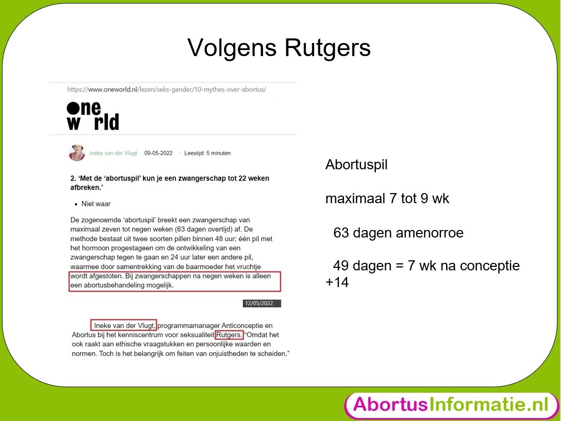 Gekozen is de lijn te handhaven van de #abortuspil bij de huisarts (voorlopig hebben zij dit gesteld op 7 wk na conceptie (9 wk amenorroe)), volgens Rutgers [zie afbeelding hieronder].