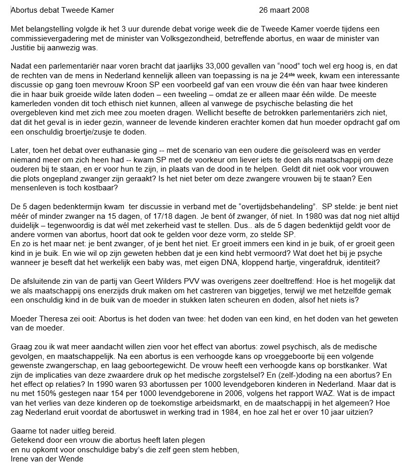 (21) Inside the Dutch parliament samples – for example with SGP, FVD, Christen Unie ‘gesprek open dag’ – or attending various debates in person inside or online. A member of SGP told me he had our bookmark on their mantelpiece (a row of photo’s of whole baby’s as they develop, with next to that a column depicting what abortion can do to the baby) as a reminder: “Dit is waar we het voor doen.” Once also addressed 3 ministers of government (including Maxime Verhagen and Bert Koenders) lunching outside on a terras ‘het Plein’, giving my abortion story, petitioning babies and offering a baby model. Was also asked to provide input for a speech/powerpoint to SP (Socialistish Partij) local chapter, which was forwarded to government.